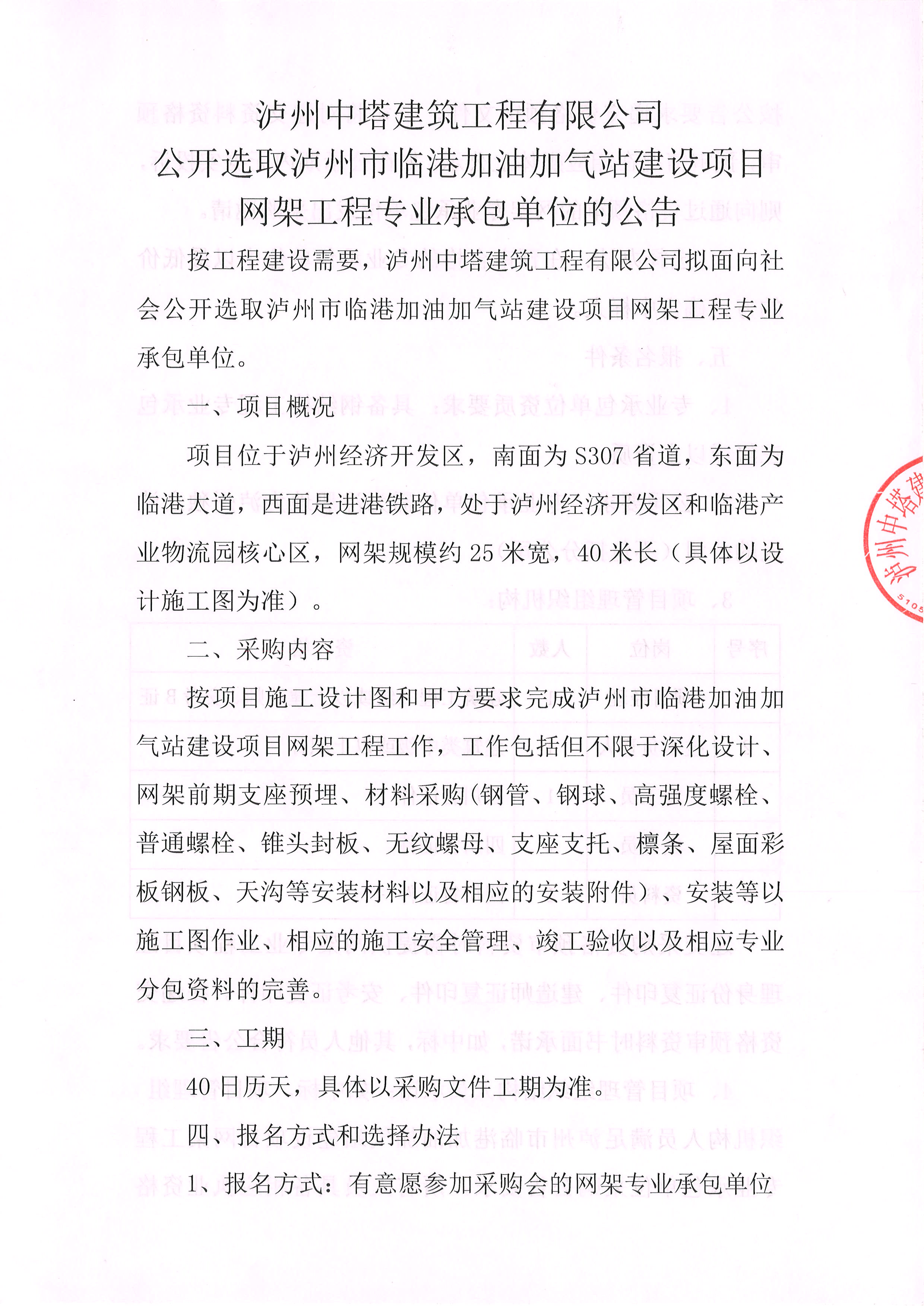 公開選取瀘州市臨港加油加氣站建設項目網架工程專業承包單位的公告