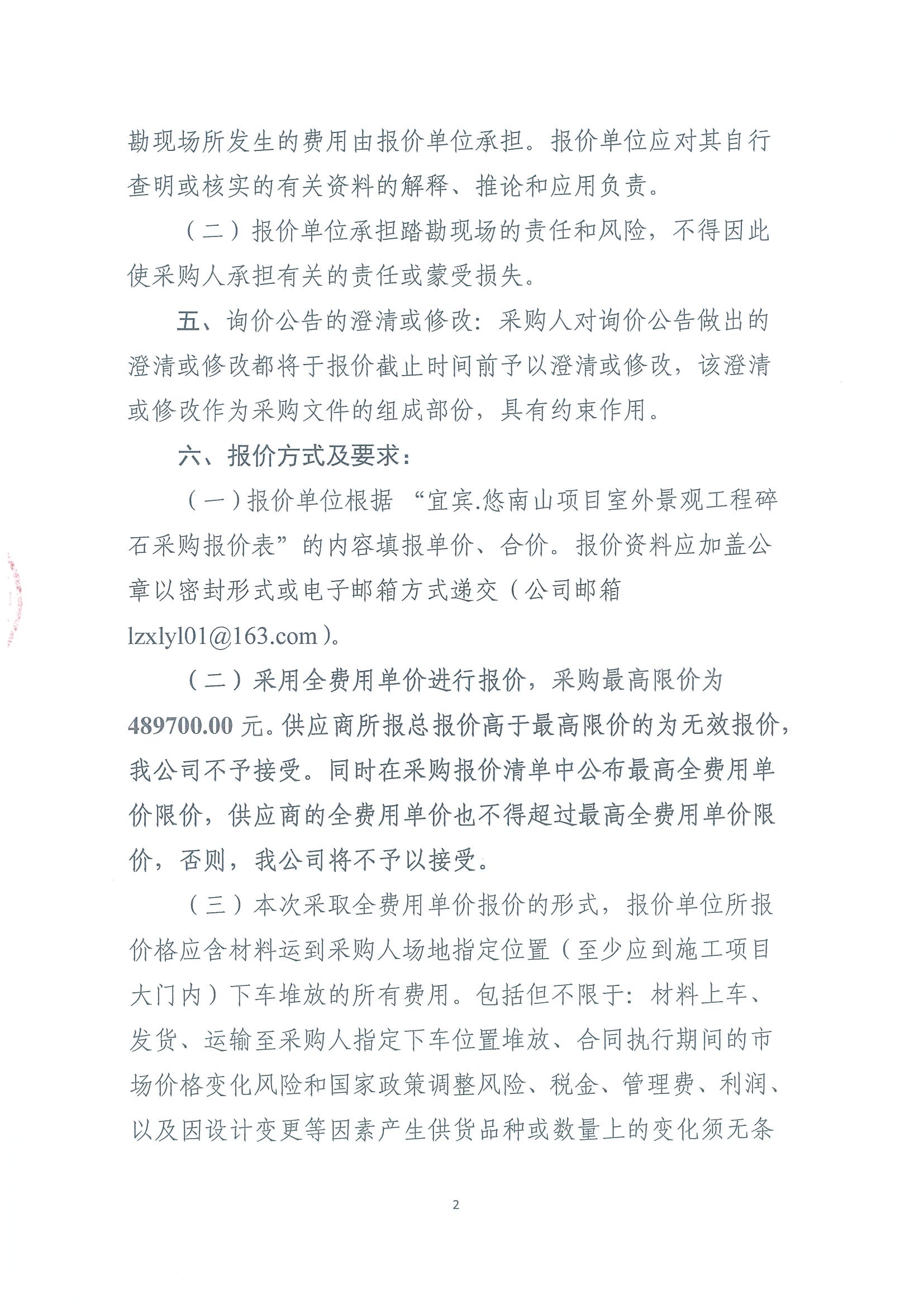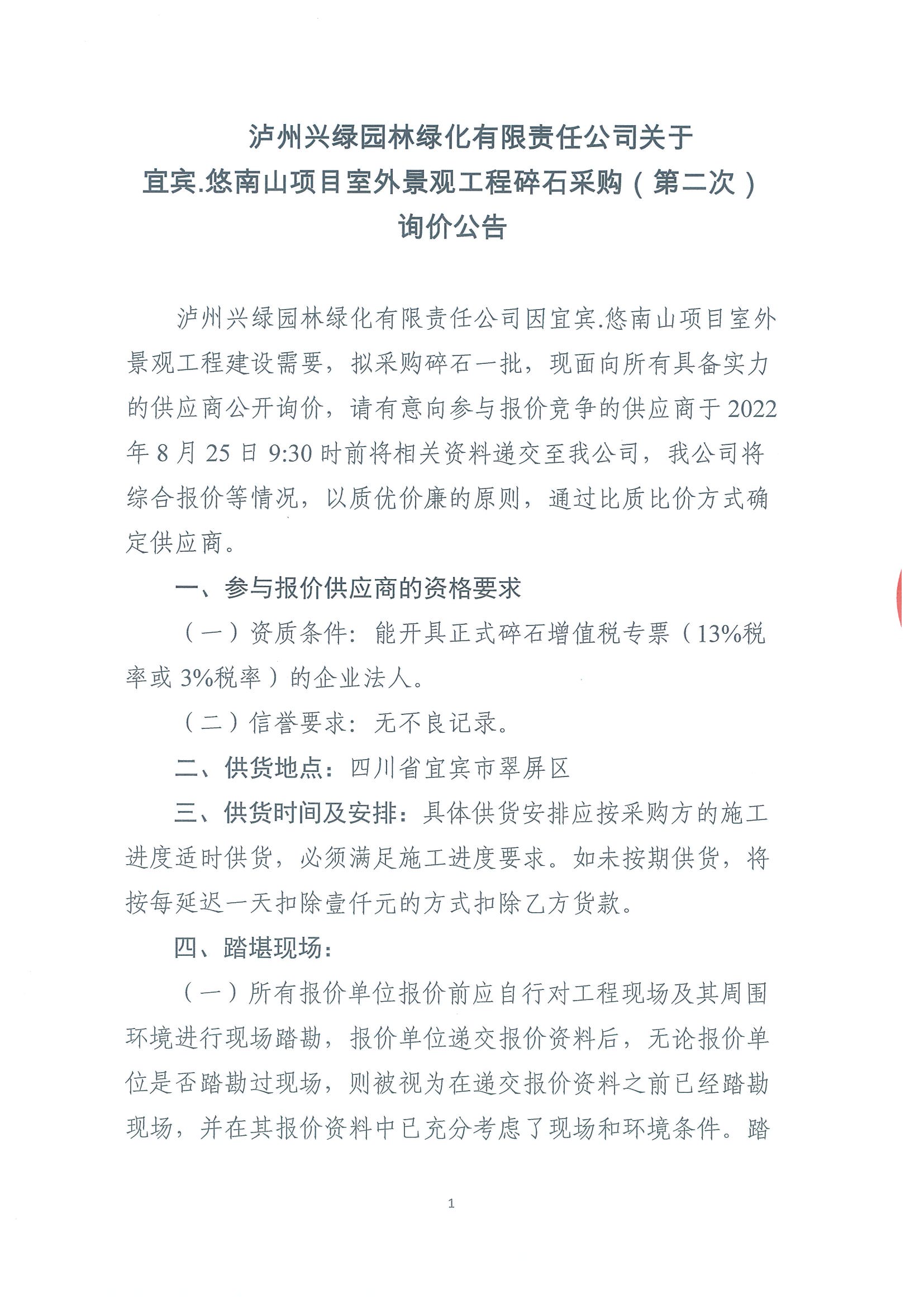 宜賓.悠南山項目室外景觀工程碎石采購(第二次)詢價公告